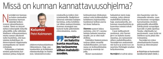 Nurmijärven uutiset 9.9.2020 Nurmijärven kunnassa kuten muissakin kunnissa haetaan säästöjä heikentyneen taloustilanteen vuoksi. Tämä on tietysti tärkeä toimenpide lyhyellä aikavälillä jolla vältetään liiallinen velkaantuminen, mutta saman aikaisesti tulisi huolehtia, että kuntalaisia kohdellaan yhdenvertaisesti riippumatta asuinpaikasta tai väestöryhmästä. Pelkästään ei lakisääteisistä palveluista karsiminen johtaa helposti yhdenvertaisuuskäsitteen rikkomiseen. Haja-asutusalueiden ja kyläläisten elämisenkuluja on lisätty mm. kiinteistöveronkorotuksella ja teiden … Jatka artikkeliin Missä on kunnan kannattavuusohjelma?