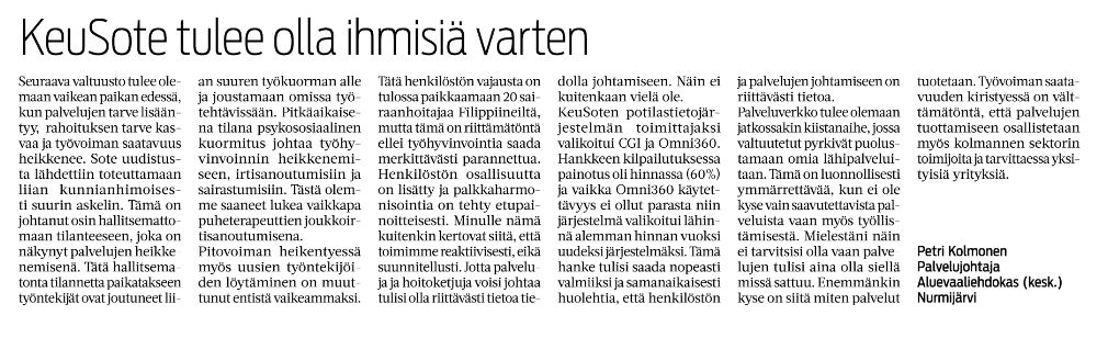 KeuSoten potilastietojärjestelmän toimittajaksi valikoitui CGI ja Omni360. Hankkeen kilpailutuksessa painotus oli hinnassa (60%) ja vaikka Omni360 käytettävyys ei ollut parasta niin järjestelmä valikoitui lähinnä alemman hinnan vuoksi uudeksi järjestelmäksi. Tämä hanke tulisi saada nopeasti valmiiksi ja samanaikaisesti huolehtia, että henkilöstön ja palvelujen johtamiseen on riittävästi tietoa.