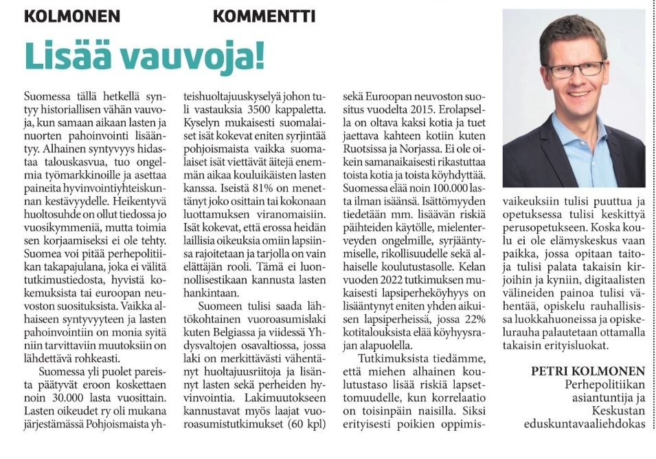 Suomessa tällä hetkellä syntyy historiallisen vähän vauvoja, kun samaan aikaan lasten ja nuorten pahoinvointi lisääntyy. Alhainen syntyvyys hidastaa talouskasvua, tuo ongelmia työmarkkinoille ja asettaa paineita hyvinvointiyhteiskunnan kestävyydelle. Heikentyvä huoltosuhde on ollut tiedossa jo vuosikymmeniä, mutta toimia sen korjaamiseksi ei ole tehty. Suomea voi pitää perhepolitiikan takapajulana, joka ei välitä tutkimustiedosta, hyvistä kokemuksista tai euroopan neuvoston suosituksista. Vaikka alhaiseen syntyvyyteen ja lasten pahoinvointiin on monia syitä niin tarvittaviin muutoksiin on lähdettävä rohkeasti.